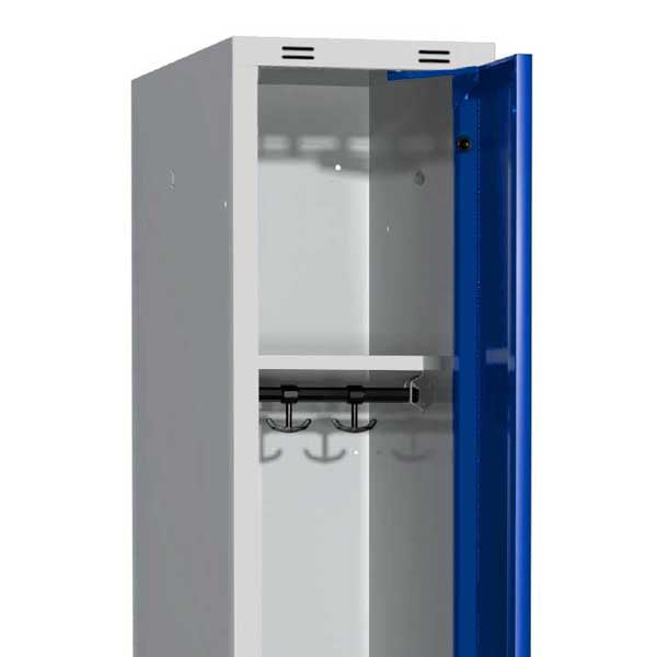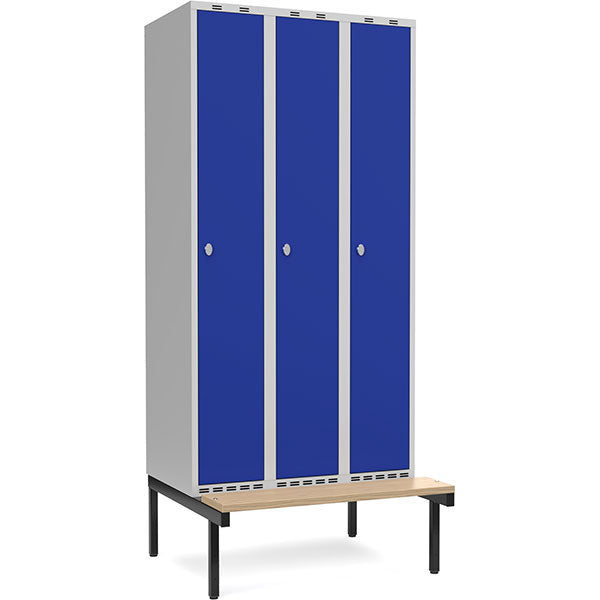 Garderobeskab 3x300mm m/lige tag, blå dør med greb for hængelås og siddebænk