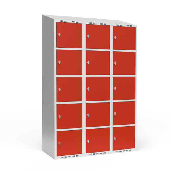 Garderobeskab 3x400 mm Skråt tag 5 rum i højden Rød dør Greb for hængelås