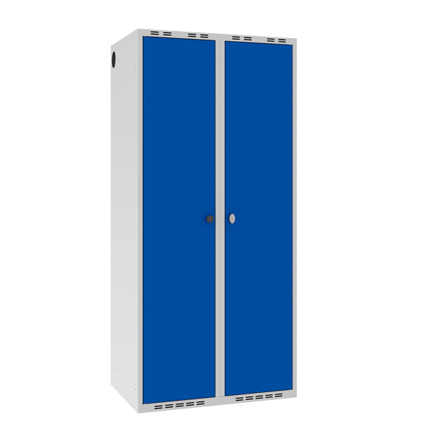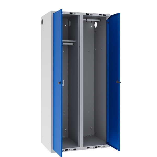 Dette POC garderobeskab leveres med lys grå kabinet RAL7035 i kombination med blå døre RAL5010, som låses med greb for hængelås – fælles lås for begge døre. Andre størrelser, låsesystemer og farvevalg er tilgængelige, kontakt os for mere information.