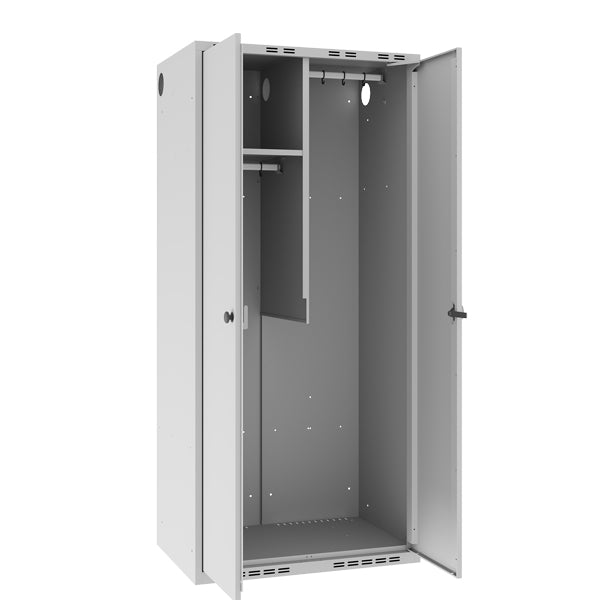 Dette POL garderobeskab leveres med lys grå kabinet RAL7035 i kombination med lys grå døre RAL7035, som låses med greb for hængelås – fælles lås for begge døre. Andre størrelser, låsesystemer og farvevalg er tilgængelige, kontakt os for mere information.