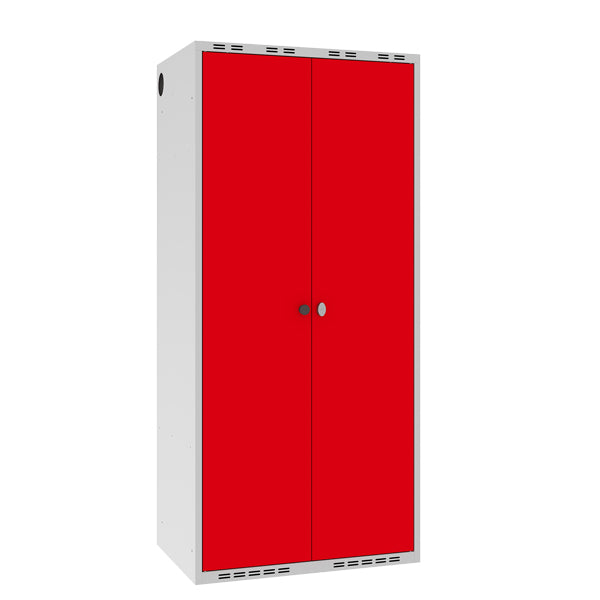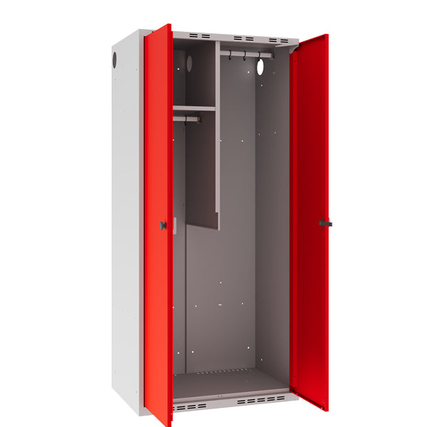 Dette POL garderobeskab leveres med lys grå kabinet RAL7035 i kombination med rød døre RAL3020, som låses med greb for hængelås – fælles lås for begge døre. Andre størrelser, låsesystemer og farvevalg er tilgængelige, kontakt os for mere information.