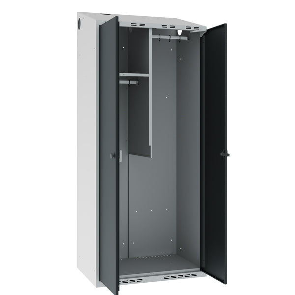 Dette POL garderobeskab leveres med lys grå kabinet RAL7035 i kombination med antracit døre RAL7016, som låses med greb for hængelås – fælles lås for begge døre. Andre størrelser, låsesystemer og farvevalg er tilgængelige, kontakt os for mere information.