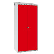 Dette POL garderobeskab leveres med lys grå kabinet RAL7035 i kombination med rød døre RAL3020, som låses med greb for hængelås – fælles lås for begge døre. Andre størrelser, låsesystemer og farvevalg er tilgængelige, kontakt os for mere information.