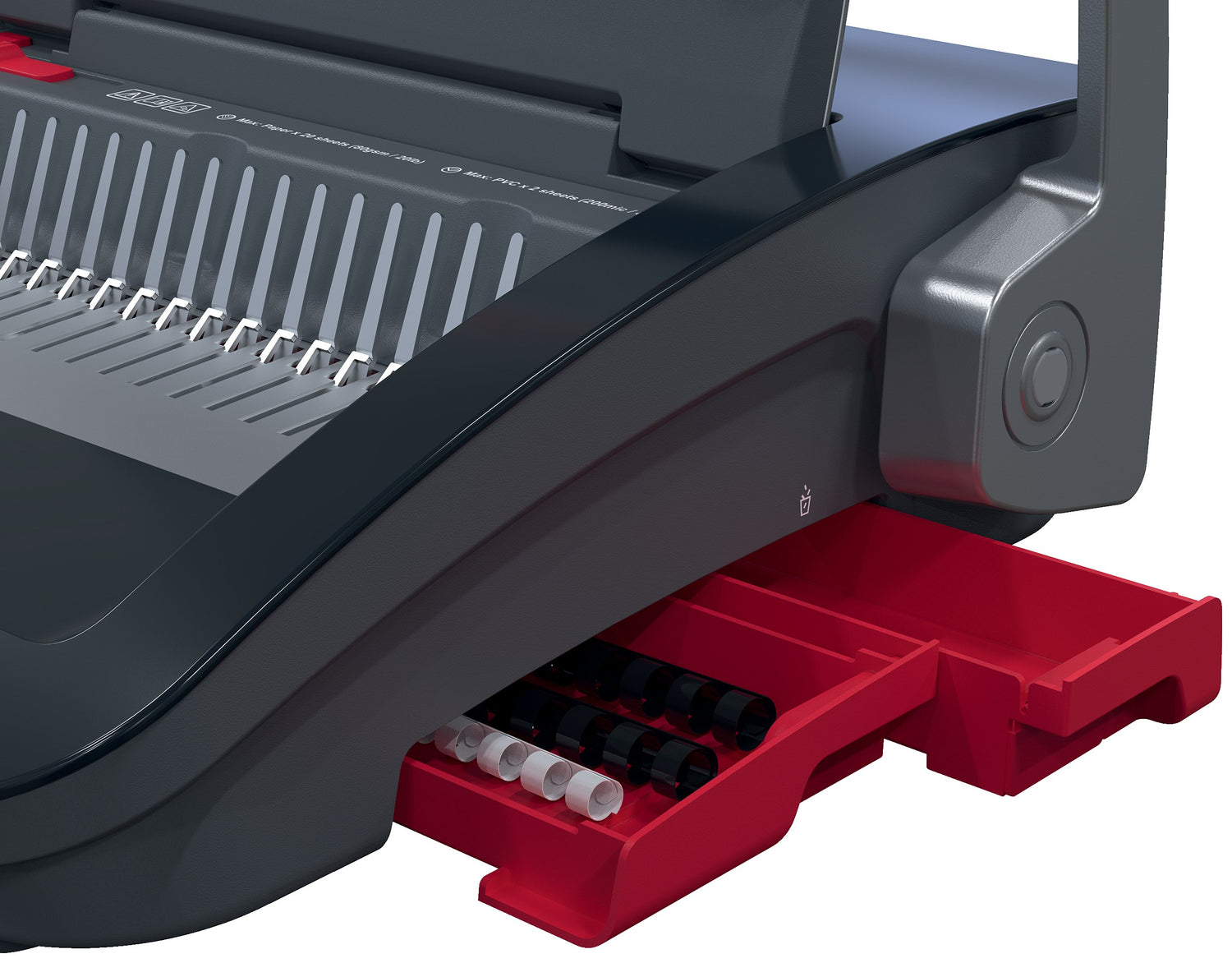 CombBind® CB20 er en pålidelig og kompakt manuel Comb indbindingsmaskine designet til fælles brug i kontor- og skolemiljøer med medium volumenkrav. Den huller ubesværet op til 20 ark (80 g) papir og kan indbinde op til 240 ark ad gangen ved hjælp af 28 mm indbindingsrygge. Dens lette, pladsbesparende design gør den ideel til brug hvor som helst, når som helst og nem at opbevare, når den ikke er i brug. For ekstra bekvemmelighed inkluderer den en bakke til papiraffald for nem bortskaffelse og et praktisk opbevaringsrum. Sort og sølv farve. - Indbinder op til 240 A5/A4-ark (80 g) ad gangen ved hjælp af en 28 mm Comb indbindbindingsryg. - Huller op til 20 ark ad gangen (80 g) - Alsidig indbinding: Indbind nemt A5-dokumenter med A5-Comb indbindingsrygge og A4-høj format med A4-Comb indbindingsrygge. - Manuel hulning for en ubesværet og jævn indbindingsoplevelse. - Sidemargenjustering for præcis justering og ensartede indbindingsresultater. - Fast margindybde for ensartet indbin