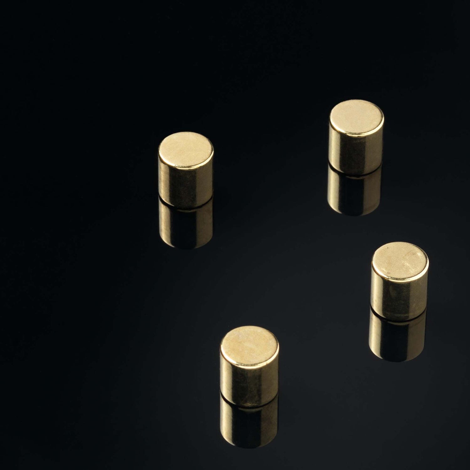 Super Stærke magneter. Guld / Stål. Cylinder. Dia. 1 cm. Højde 1 cm.Magneten er perfekt til glastavler og finertavler, kan bruges på alle magnetiske tavler.