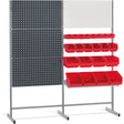Gulvstativ, kombination 3 består af 2 fag gulvreoler m/T-fod og inkl. 3 stk værktøjstavler h x b = 480 x 870 mm, whiteboard h x b = 480 x 870 mm, 1 hylde og 3 stk. ophængslister - inkl. røde lagerkasser - 8 stk 2067, 6 stk 2074 og 8 stk 2075.Specifikationer: