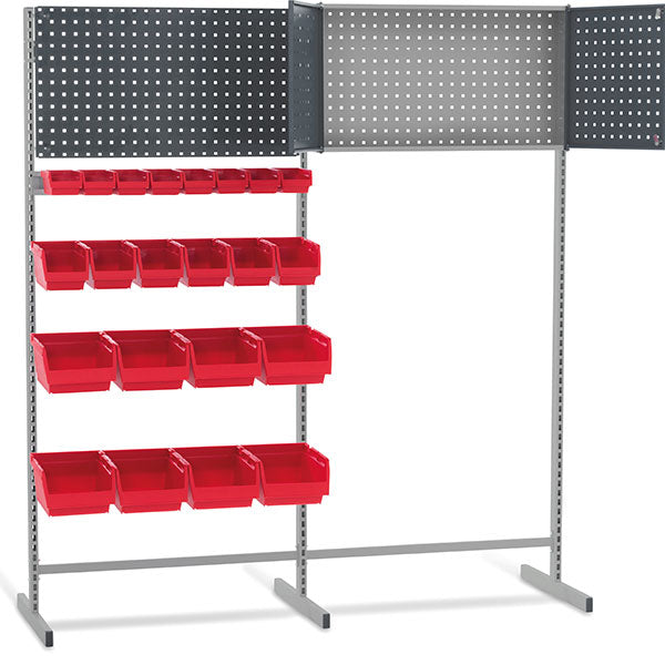 Stativet består af 2 fag gulvreoler med T-fod, 1 værktøjstavle på 480 x 870 mm, 1 perforeret værktøjskab, 1 hylde, 3 ophængslister og forskellige røde lagerkasser.