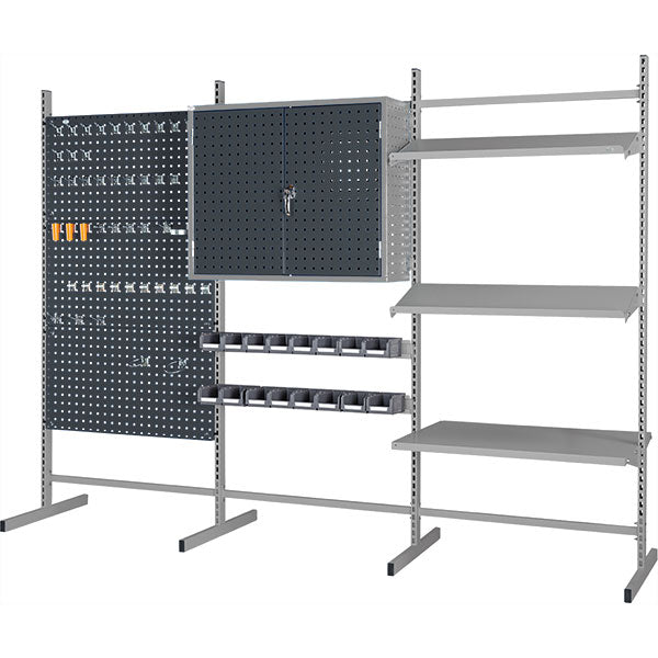 Gulvstativ kombination 5, består af 3 fag gulvreoler m/T-fod og inkluderer 3 stk værktøjstavler h x b = 480 x 870 mm, 1 stk perforeret værktøjsskab, 2 stk ophængslister inkl. 16 stk grå lagerkasser 2075, 2 hylder m/dybde 300 mm og 1 hylde m/dybde 613mm.