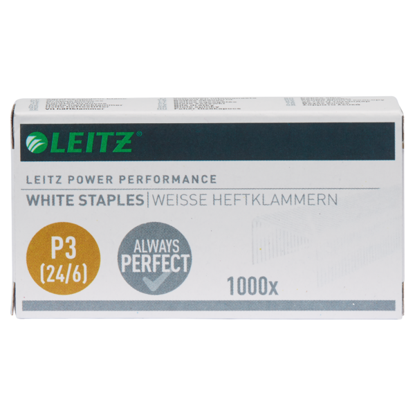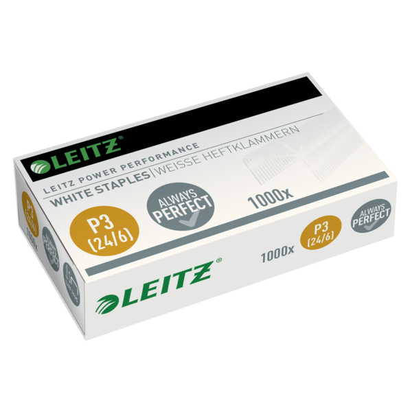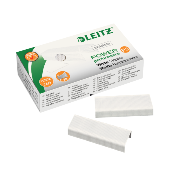 Hvide hæfteklammer for diskret hæftning. 24/6 kraftige stålklammer. Anvendes med Leitz hæftemaskine for bedste resultat.