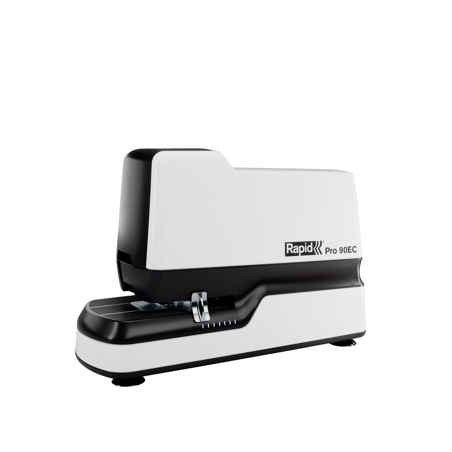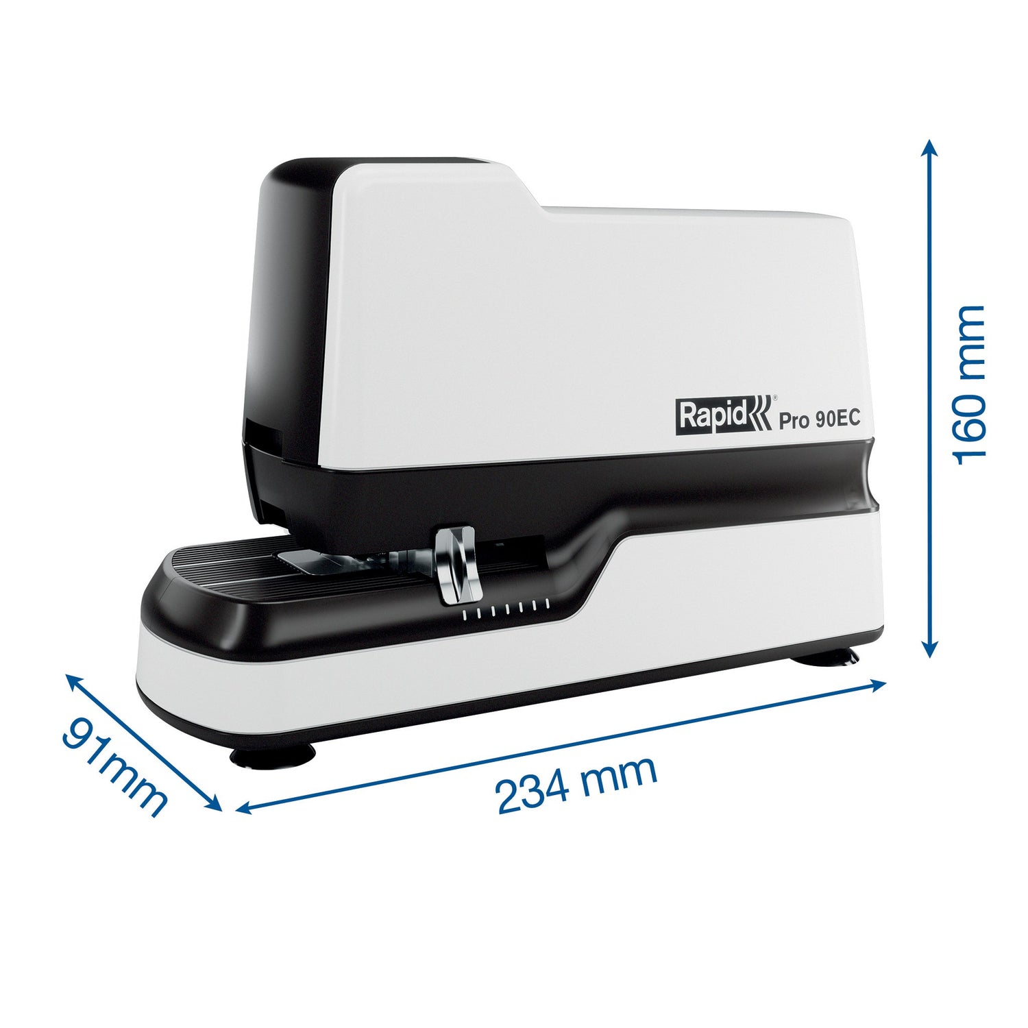 Den elektriske hæftemaskine Pro 90EC hæfter hurtigt og ubesværet op til 50 ark papir ad gangen (80g), så du sparer tid på arbejdet. Denne full strip hæftemaskine med høj kapacitet er fuldautomatisk og ideel til brug i et kontor- eller industrimiljø. 90EC hæfter 3 gange hurtigere end f.eks. den elektriske hæftemaskine Rapid 5050e, samtidig med at den automatisk justerer hæftekraften. Den justerbare papirindføringsdybde og den trykte guide til placering af hæfteklammer giver en fleksibel, men præcis placering af hæfteklammerne. Du løber aldrig tør for hæfteklammer takket være LED-indikatoren, der blinker, når hæfteklammerne er ved at slippe op. Nem frontladning af hæfteklammer. Sørg for hæftning uden papirstop, når du bruger Rapid No.66 eller No.44 hæfteklammer. Hygiejnisk hæftning takket være berøringsfri kontaktløs brug. Sugefødder på enhedens bund sikrer ekstra stabilitet på en plan overflade. Drives af en netadapter (medfølger). Leveres med en æske med 630 stk. hæfteklammer nr. 66/7.