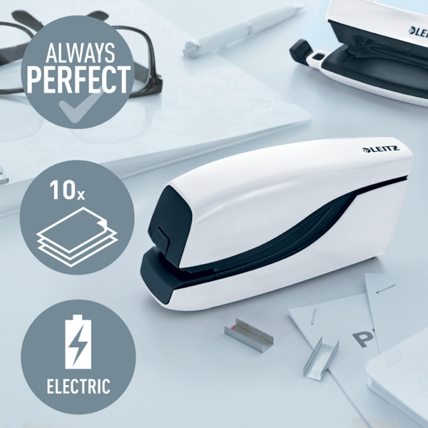 Oplev ultimativ bekvemmelighed med vores batteridrevne hæftemaskine i WOW farver. Den er perfekt til hyppig brug og sikrer hygiejnisk hæftning uden behov for berøring. Ideel til både skrivebordet og på farten, denne stilfulde hæftemaskine kan hæfte op til 10 ark med Leitz e1 hæfteklammer, som garanterer fejlfri resultater hver gang.