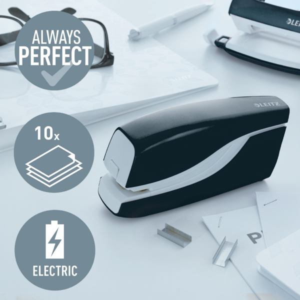 Ideel til frekvent brug. Hygiejnisk hæftning, da man ikke behøver at røre ved hæftemaskinen for at bruge den. I slående WOW farver, som lader din personlighed skinne igennem. Batteridrevet til bekvem brug på farten. Leitz e1 hæfteklammer sikrer perfekt hæftning hver gang.