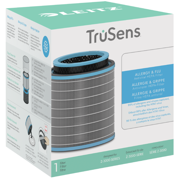 Boost beskyttelsen mod influenza og allergier hele året med dette alt-i-et HEPA luftrenser filtersystem Kombinationsfilteret har 3 niveauer af filtrering som beskyttelse mod influenza-virus og andre luftbårne allergener; et holdbart net forfilter, et anti-viralt HEPA filter og et aktivt kulfilter. FIltertromlen er kernen i at rense din luft, da den fanger 99,97% af luftbårne allergener og vira inklusive H1N1 virus. For at få en optimal luftrensning anbefales det at udskifte HEPA filtertromlen hver 12. måned afhængig af brug. Konvertibel med alle Leitz TruSens Z-3000/Z-3500 store luftrensere.