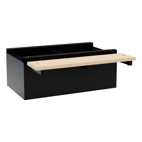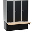 Høj sokkel med bænkkonsol til garderobeskabe med bredde 1000 mm og dybde 550 mm. Sokkelhøjde er 320 mm, som lægges til skabets højde for at få en totalhøjde. Produceret af pulverlakeret metal. Farve sort RAL 9005. Siddebænk i birk højtrykslaminat. Total dybde er 865 mm.