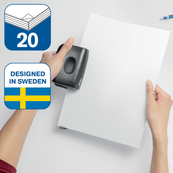 Organiser dit papirarbejde med dette alsidige 2-huls hulapparat. Fremstillet af 74% recirkuleret plast og pakket i 100% genanvendt pap, kombinerer det holdbarhed med miljøvenlighed. Det robuste metalhus og det forstærkede håndtag sikrer præcis hulning af op til 20 ark (80g).
