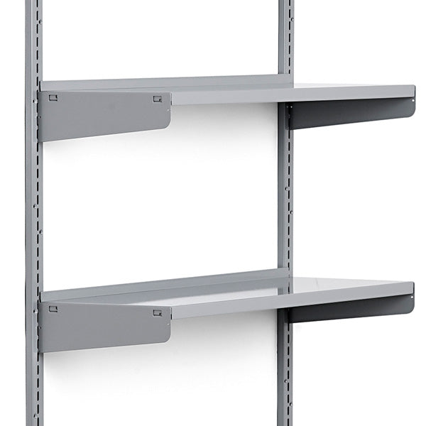 Stålhylde med høj bagkant. Hylden kan klare en belastning på 50 kg, jævnt fordelt. Husk over- eller underkonsol tilpasset hyldedybde.