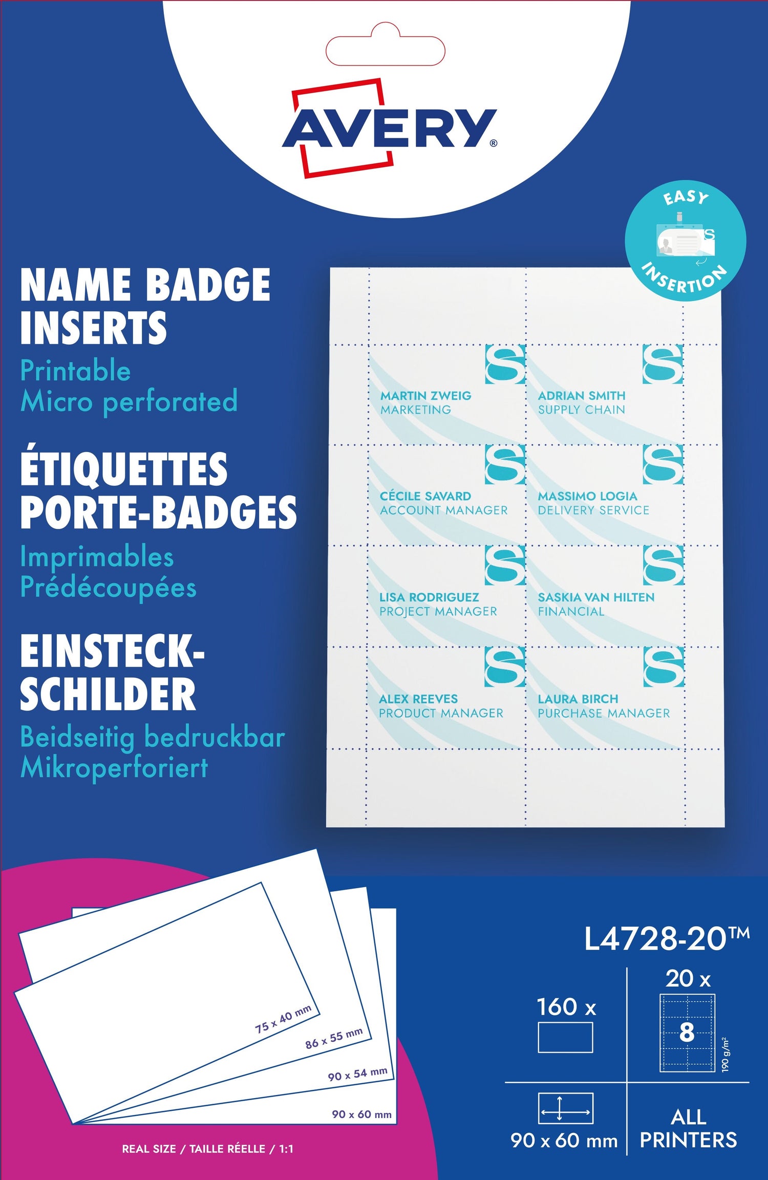De hvide printbare indstik L4728-20 fra Avery i formatet 60x90 mm gør det nemt at organisere begivenheder og konferencer (160 hvide printbare indstik pr. pakke). De matte, hvide printbare indstik med 190 g/m² har en ekstra fin perforering. De sikrer problemfri udskrivning på alle standard inkjet- og laserprintere. Design og print dine navneskilte hurtigt og nemt – for gratis skabeloner: www.avery.eu/print.