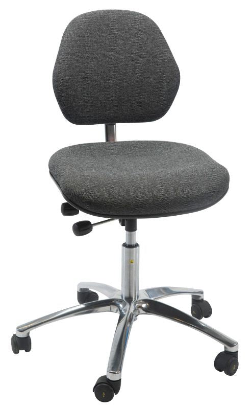 ESD kontorstol, hvis du skal sidde i længere tid. Ledende stol, hvor sæde og ryg er betrukket med et specielt stof, hvor metaltråde er indvævet i stoffet, modstand mod jord = 10 ohm. Stolen har enkel trinløs justering af både sæde og rygstøtte ved hjælp af den globalt designede sædemekanisme. Letrullende ESD hjul. Rygstøtte: 16° ??forover og 6° bagover, sæde: 12° forover og 3° bagover.