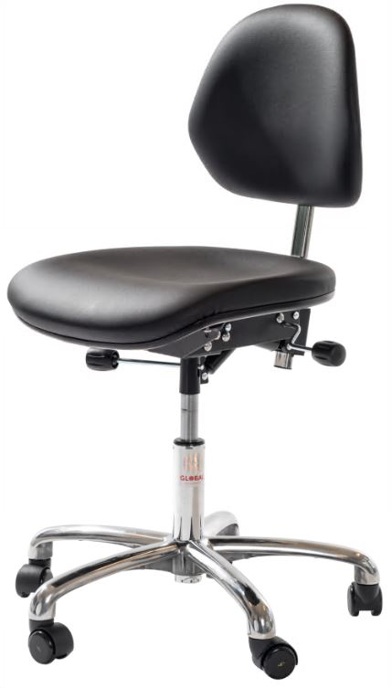ESD kontorstol, hvis du skal sidde i længere tid. Ledende stol, hvor sæde og ryg er betrukket med kunstlæder. Stolen er blød og god at sidde på, samtidig med at den er let at rengøre.Stolen har enkel trinløs justering af både sæde og rygstøtte ved hjælp af den globalt designede sædemekanisme. Rygstøtte: 16° ??forover og 6° bagover, sæde: 12° forover og 3° bagover. Stolen leveres med 610 mm aluminiumskryds, fodring og ESD hjul hvoraf 2 stk er med brems.