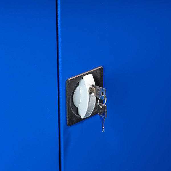 Kemikalieskab med blå, 2-låger og låsbar dør, med udvendig højde 1990 mm og Bredde 1000 mm. Leveres komplet med 4 stk. galvaniserede hylder tilpasset kemikalie- og væskespild.