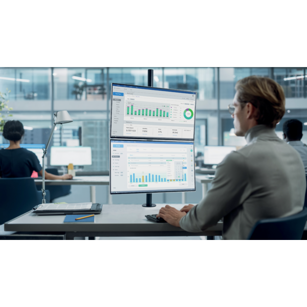 Kensingtons vertikale stabelbare dobbelte monitor arm er ideel til at maksimere skrivebordspladsen, samtidig med at den tilbyder sikker og stabil lodret positionering af to skærme op til 32" eller 9 kg.