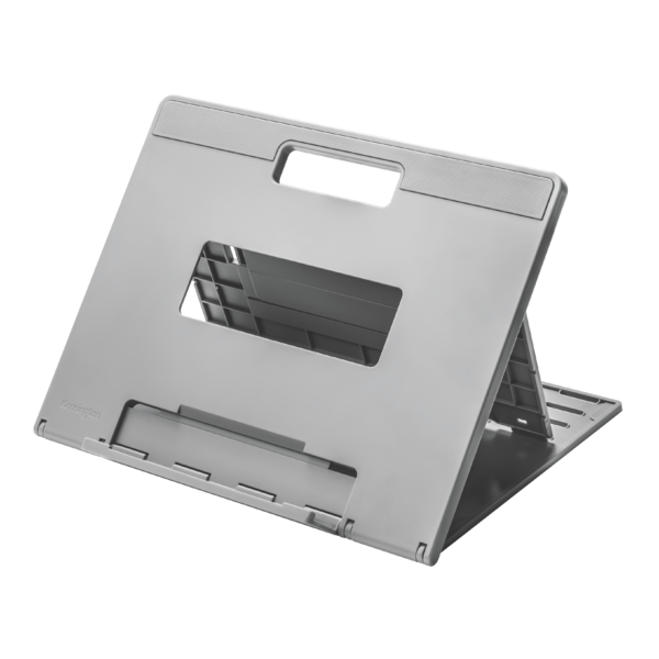 Opnå optimal ergonomi med Kensington® SmartFit® Easy Rise™ Go laptop riser og kølestand i grå. Dette justerbare 2-i-1 design forbedrer kropsholdning og komfort ved at justere højde og vinkel, samtidig med at det holder din bærbare computer kølig.