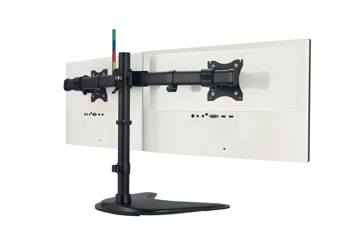 Monitor armen er designet i holdbare stålmaterialer med en tung base for stabilitet.