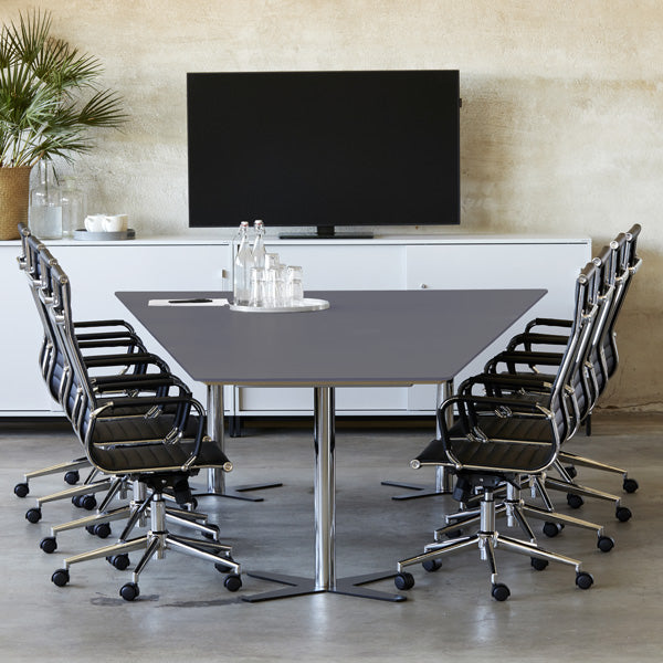 Konferencebord i DNA møbelserie, med antracit trapez bordplade på sort understel. Længde x største dybde er 5000 x 2365 mm.Med større brug af skærm og udstyr for videokonference i møderum, har også behovet for synsoptimale mødebord meldt sig. Derfor tilbyder vi som en naturlig del af møbelserien DNA, et udvalg trapez formede konferenceborde. Dette er flotte og prisgunstige borde som ikke går på kompromis med hverken design eller kvalitet. Bordpladen er 25 mm, antracit laminat, afrundede hjørner med lige kant i antracit farve. Dette er stiligt!