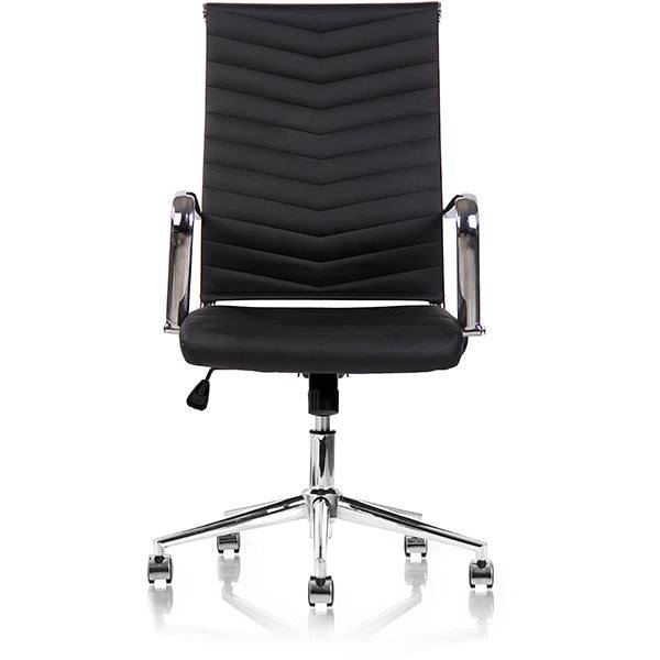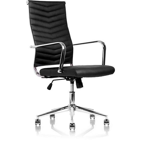 JUEL leveres i sort kunstlæder, med krom armlæn og V-mønstret ryg og sæde.Det behagelige sæde er polstret for bedre siddekomfort. Og for optimal brug i mødelokalet, er JUEL svingbar, med enkel vippefunktion og justering af siddehøjde.