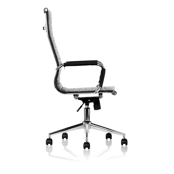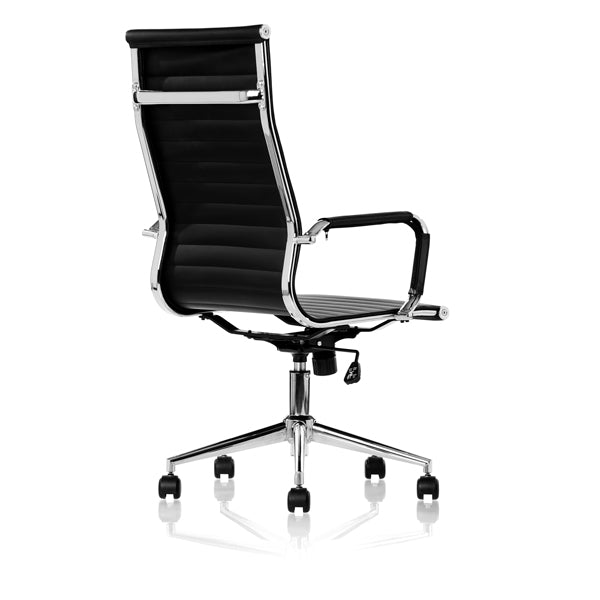 Konferencestol ZARETO har V-mønstret ryg og sæde i sort kunstlæder, leveres med armlæn og har justerbar siddehøjde.