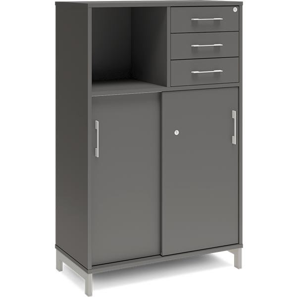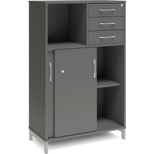 3A4 kontorskab i kontormøbelserien DNA, med 2A4 skydedør og skuffemodul, udvendig bredde x dybde x højde, 800 x 400 x 1275 mm, inkl. understel. Dette kontorskab leveres med antracit laminat kabinet i kombination med antracit laminat døre og skuffer, det hele på et flot alugråt understel, miljørigtig pulverlakeret.Specifikationer: