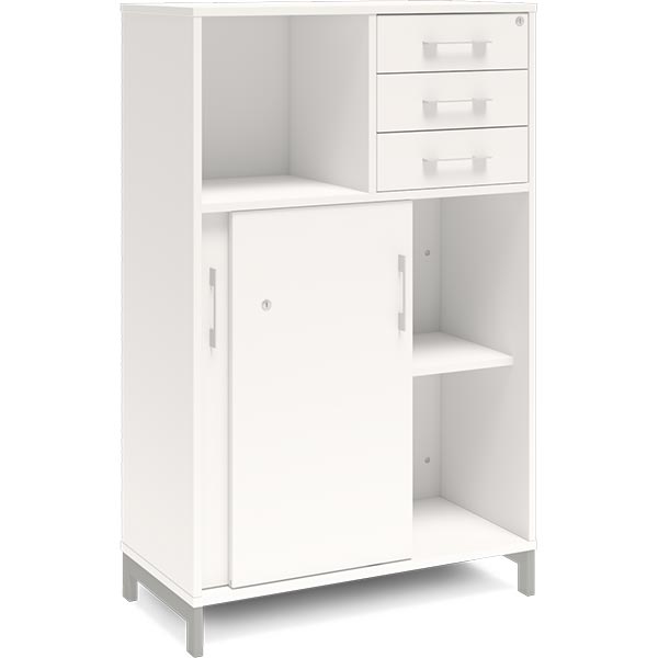 3A4 kontorskab i kontormøbelserien DNA, med 2A4 skydedør og skuffemodul, udvendig bredde x dybde x højde, 800 x 400 x 1275 mm, inkl. understel. Dette kontorskab leveres med hvidt laminat kabinet i kombination med hvide laminat døre og skuffer, det hele på et flot alugråt understel, miljørigtig pulverlakeret.Specifikationer: