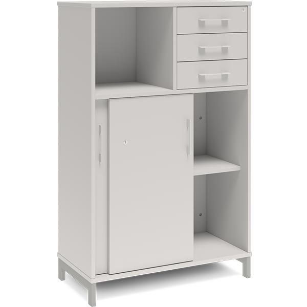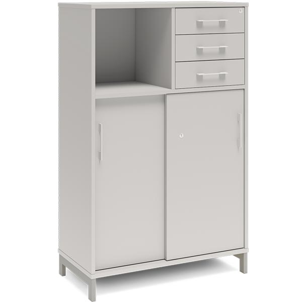 3A4 kontorskab i kontormøbelserien DNA, med 2A4 skydedør og skuffemodul, udvendig bredde x dybde x højde, 800 x 400 x 1275 mm, inkl. understel. Dette kontorskab leveres med lys grå laminat kabinet i kombination med lys grå laminat døre og skuffer, det hele på et flot alugråt understel, miljørigtig pulverlakeret.Specifikationer: