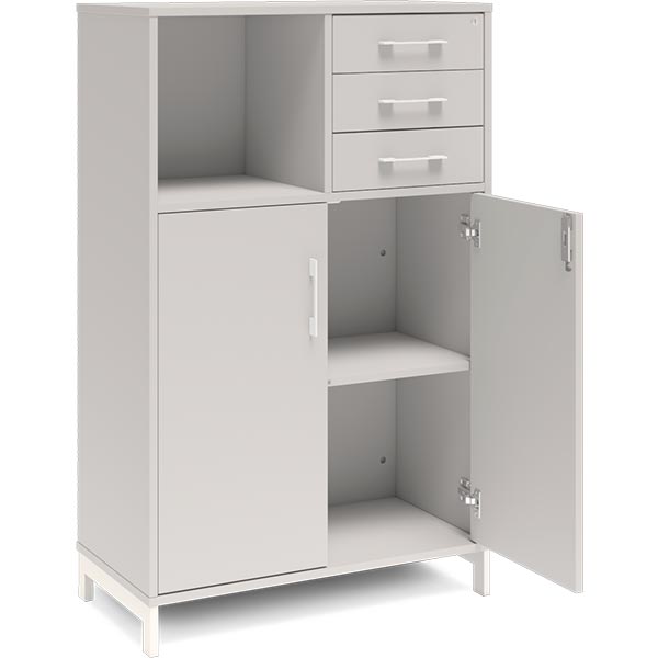 3A4 kontorskab i kontormøbelserien DNA, med 2A4 dør og skuffemodul, udvendig bredde x dybde x højde, 800 x 400 x 1275 mm, inkl. understel. Dette kontorskab leveres med lys grå laminat kabinet i kombination med lys grå laminat døre og skuffer, det hele på et flot hvidt understel, miljørigtig pulverlakeret.Specifikationer: