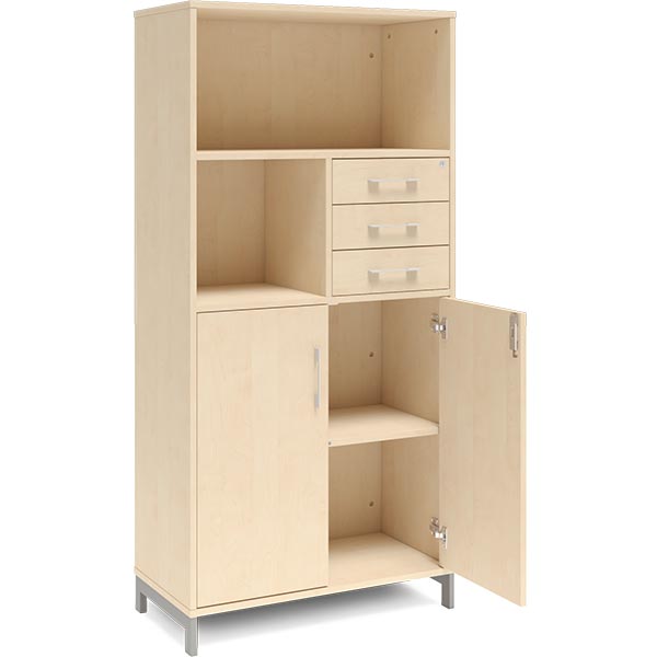 4A4 kontorskab i kontormøbelserien DNA, med 2A4 dør og skuffemodul, udvendig bredde x dybde x højde, 800 x 400 x 1660 mm, inkl. understel. Dette kontorskab leveres med birk laminat kabinet i kombination med birk laminat døre og skuffer, det hele på et flot alugråt understel, miljørigtig pulverlakeret.Specifikationer:
