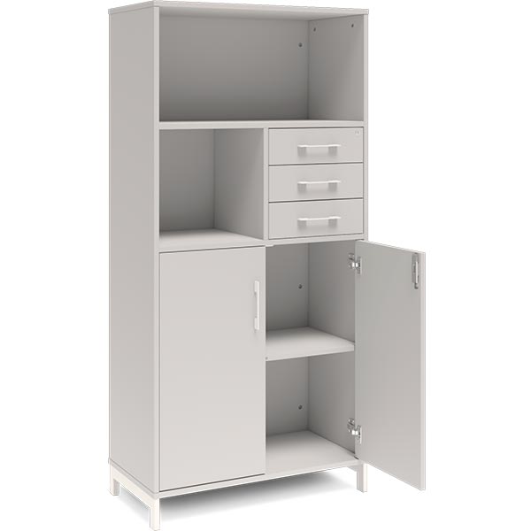 4A4 kontorskab i kontormøbelserien DNA, med 2A4 dør og skuffemodul, udvendig bredde x dybde x højde, 800 x 400 x 1660 mm, inkl. understel. Dette kontorskab leveres med lys grå laminat kabinet i kombination med lys grå laminat døre og skuffer, det hele på et flot hvidt understel, miljørigtig pulverlakeret.Specifikationer: