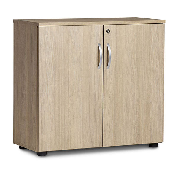 2A4 kontorskab i kontormøbelserien Ekoflex fra brandet Ergoff, udvendig bredde x dybde x højde 800 x 355 x 745 mm. Dette låsbare kontorskab leveres i eg (amber oak) laminat og har justerbare fødder til korrigering af ujævne gulve (op til 15 mm justering).