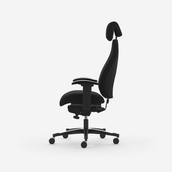 Stolen har ergoflex armlæn og nakkestøtte beklædt med tekstil.