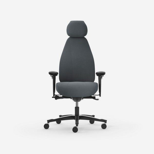 Stolen har et Dux-sæde, hjulkryds i sort aluminium, ergoflex armlæn og nakkestøtte i tekstil.