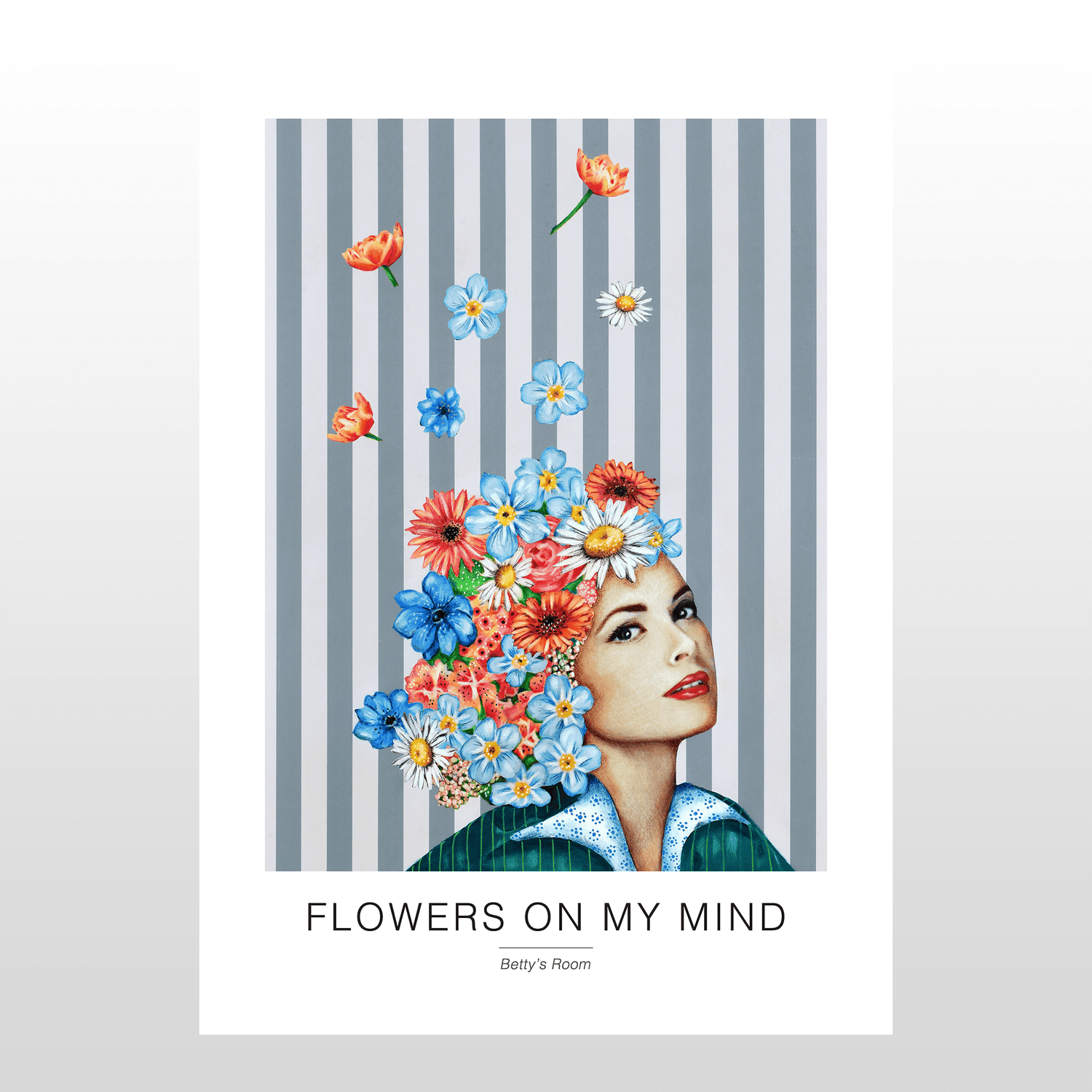 Kunstplakat "Flowers on my mind" A2 (42 x 59,4 cm.) fra Betty's Room. Flot kunsttryk på kraftigt galleripapir, med mat finish.Kunstneren Betty's Room arbejder med collage og maleri i vintage og retrostil. Ideerne til hendes billeder udspringer ofte et enkelt lille udklip, farver hun ser, smukke billeder, en titel og historier. Alt bliver bygget sammen som et puslespil af udklip, ofte fra magasiner fra 50erne, med lim, akryl farver, akvarelkridt, blyant og tusch.