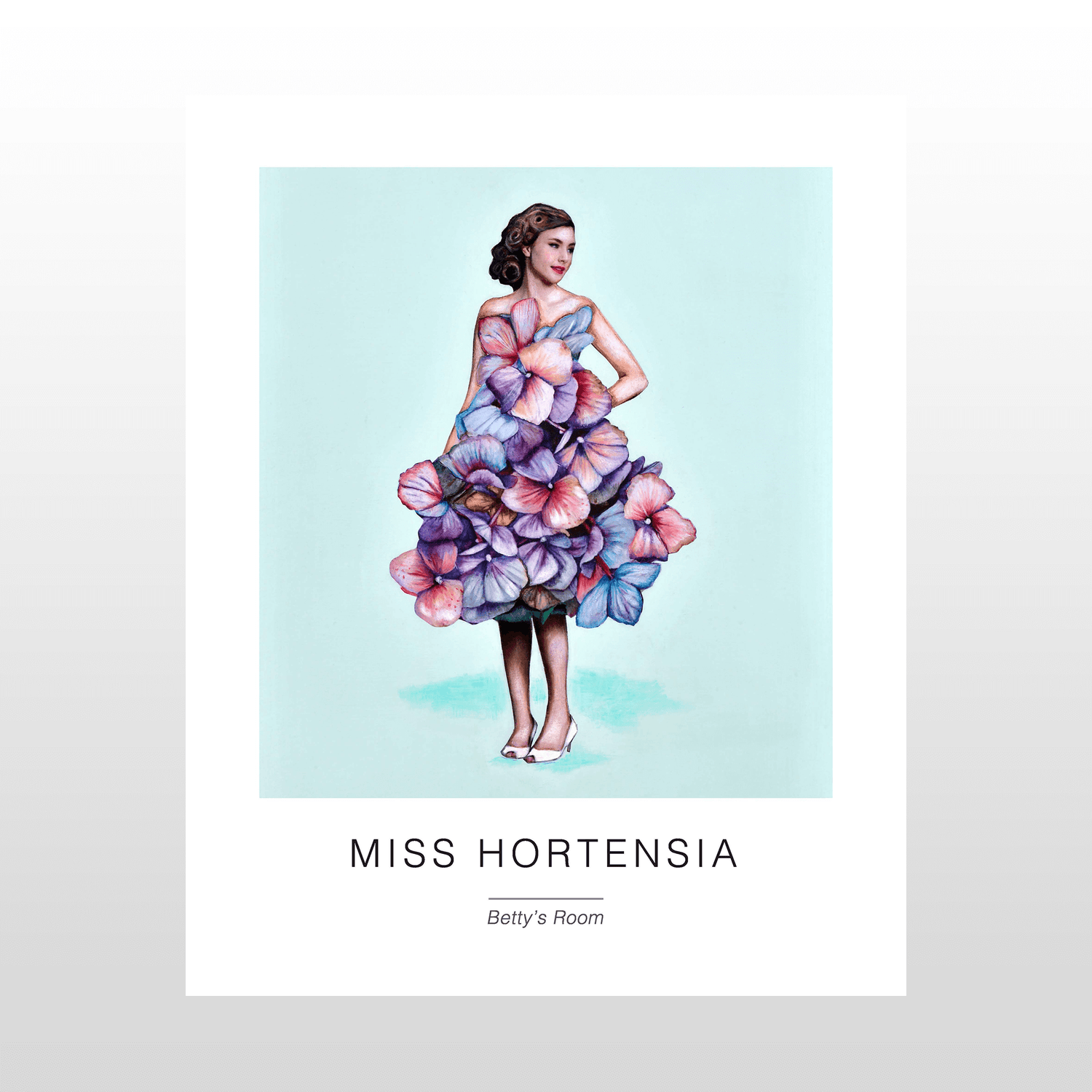 Kunstplakat "Miss Hortensia" 40 x 50 cm. fra Betty's Room. Flot kunsttryk på kraftigt galleripapir, med mat finish.Kunstneren Betty's Room arbejder med collage og maleri i vintage og retrostil. Ideerne til hendes billeder udspringer ofte et enkelt lille udklip, farver hun ser, smukke billeder, en titel og historier. Alt bliver bygget sammen som et puslespil af udklip, ofte fra magasiner fra 50erne, med lim, akryl farver, akvarelkridt, blyant og tusch.