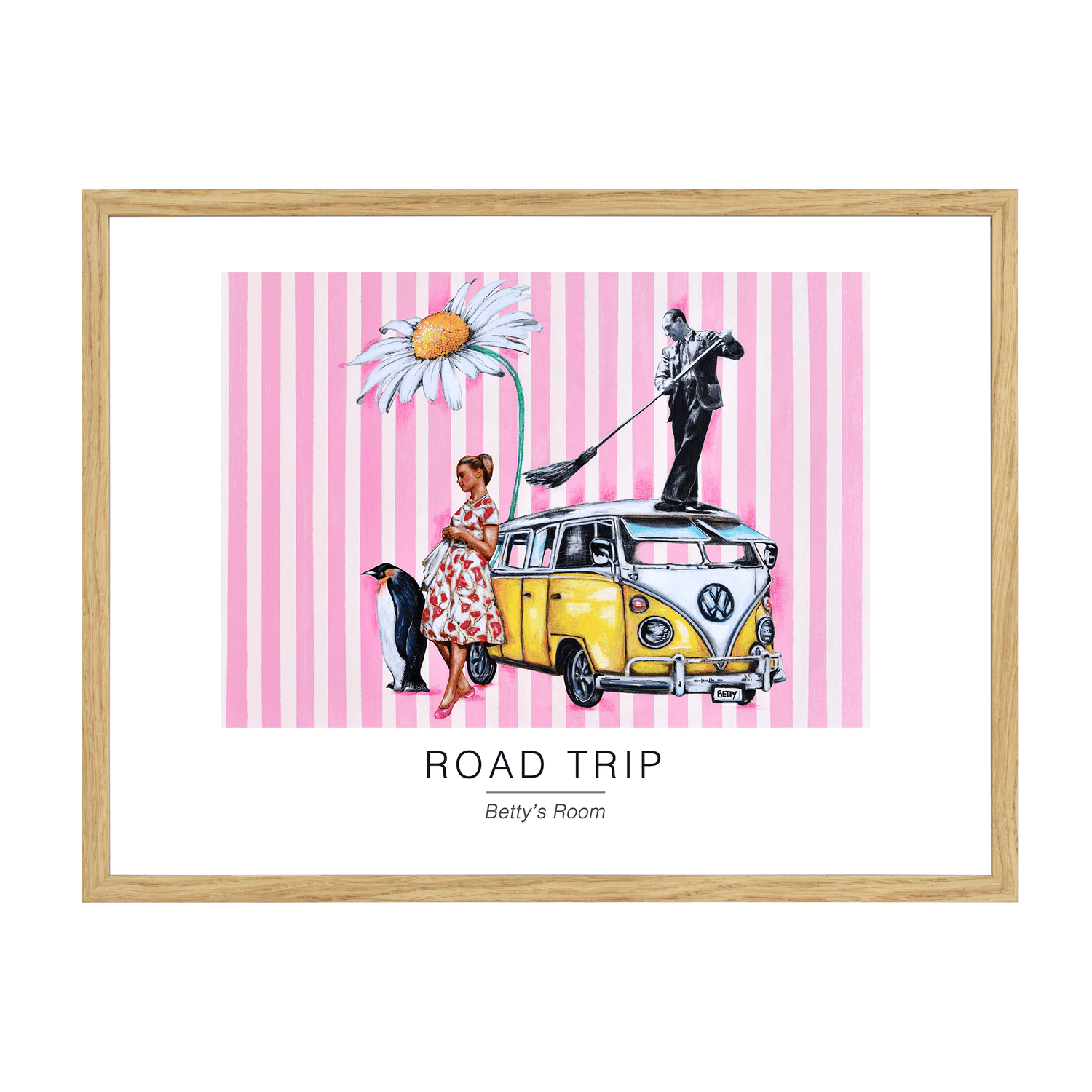 Kunstplakat "Road trip" 40 x 30 cm. fra Betty's Room. Flot kunsttryk på kraftigt galleripapir, med mat finish.Kunstneren Betty's Room arbejder med collage og maleri i vintage og retrostil. Ideerne til hendes billeder udspringer ofte et enkelt lille udklip, farver hun ser, smukke billeder, en titel og historier. Alt bliver bygget sammen som et puslespil af udklip, ofte fra magasiner fra 50erne, med lim, akryl farver, akvarelkridt, blyant og tusch.