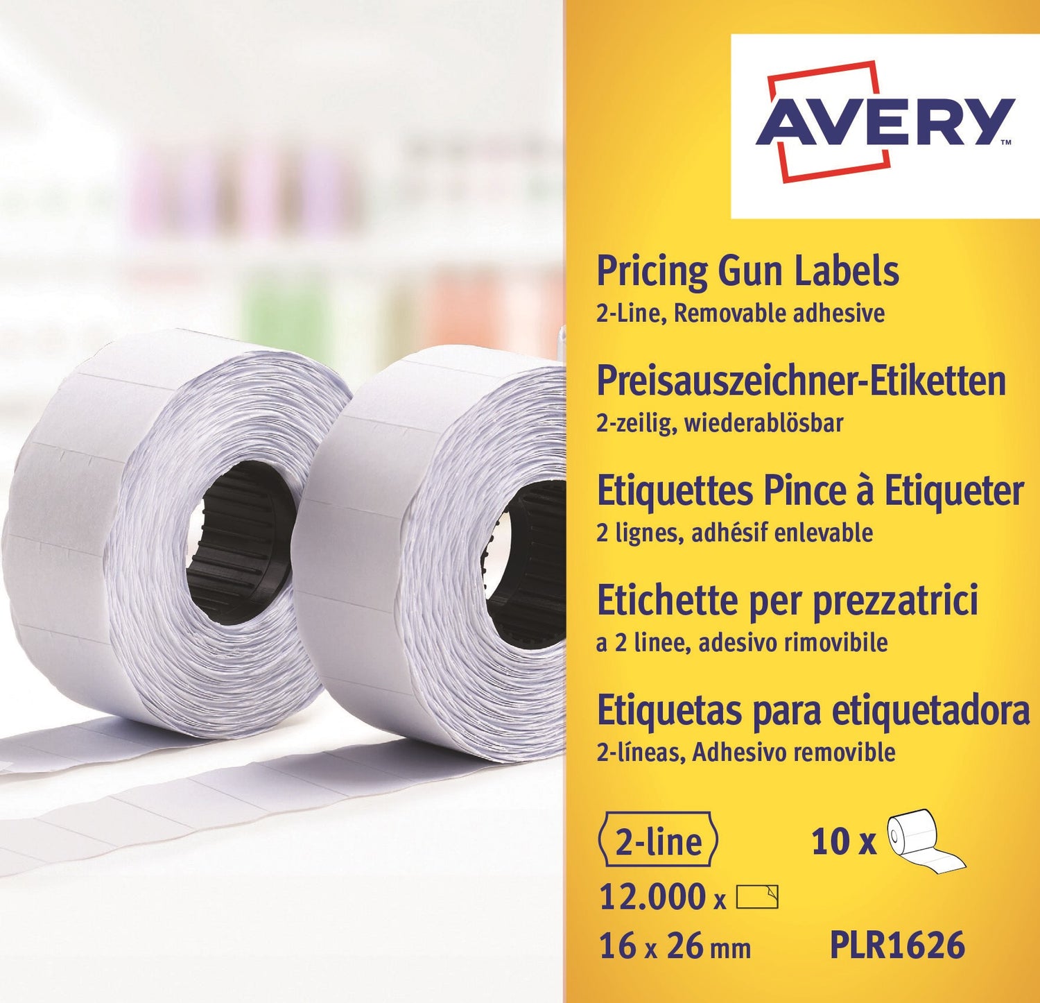 PLR1626 is a package with white removable price tags that fits Avery's price gun PL2 / 18 for two lines. The price tag attaches well, but can easily be removed without leaving adhesive residue. Label size 26 x 16 mm. The price tags have the traditional price tag shape and have a security perforation that prevents tampering. The price tag has room for max. 8 alphanumeric characters on the top row and max. 10 alphanumeric characters on the bottom. The package contains 10 rolls of 1,200 price tags, a total of 12,000 labels.