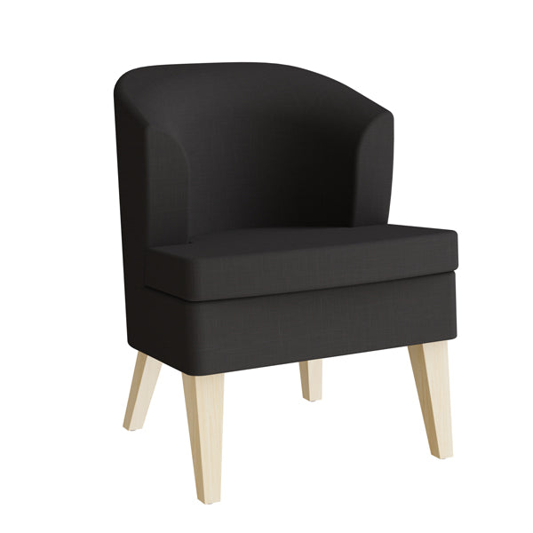 Lænestol Halvan har ramme i birk. Sæde i koldskummet polyester. Fast betræk i sort tekstil.