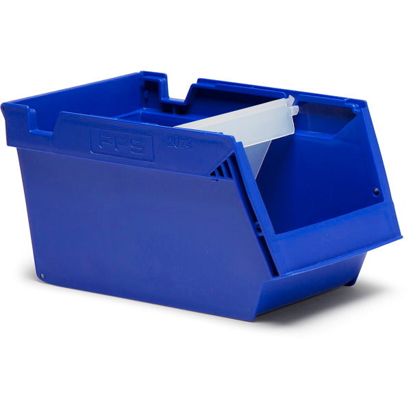 Lagerkasse med B x D x H = 148 x 250 x 130 mm, i blå udførelse. Lagerkassen har plads til 1 skillevæg, se relaterede produkter.
