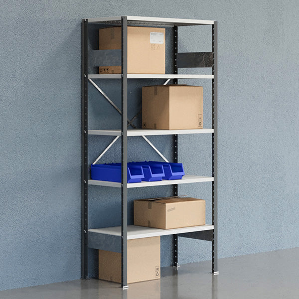 Lagerreol V06 2100x1000x500. Levereres komplet med 4 stolper med fod, 4 tværplader, 1 rygkryds og 5 hylde med hyldekroge. Mørkegrå stolper, RAL 7012 og hylder i lysegrå RAL 7035.