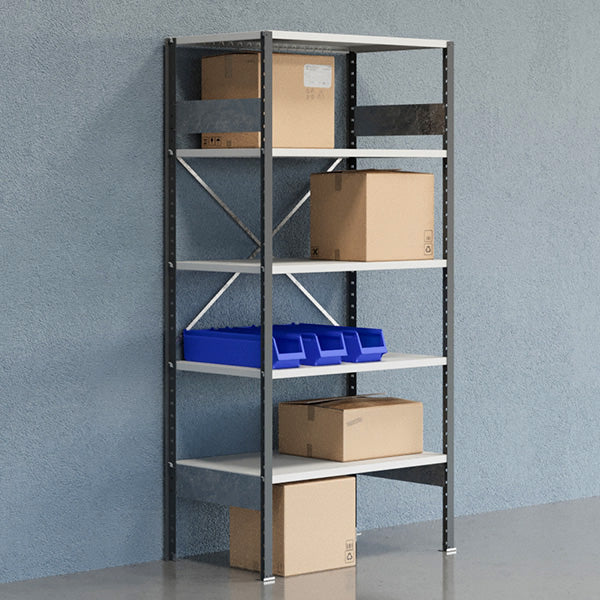 Lagerreol V06 2100x1000x600. Levereres komplet med 4 stolper med fod, 4 tværplader, 1 rygkryds og 5 hylde med hyldekroge. Mørkegrå stolper, RAL 7012 og hylder i lysegrå RAL 7035.