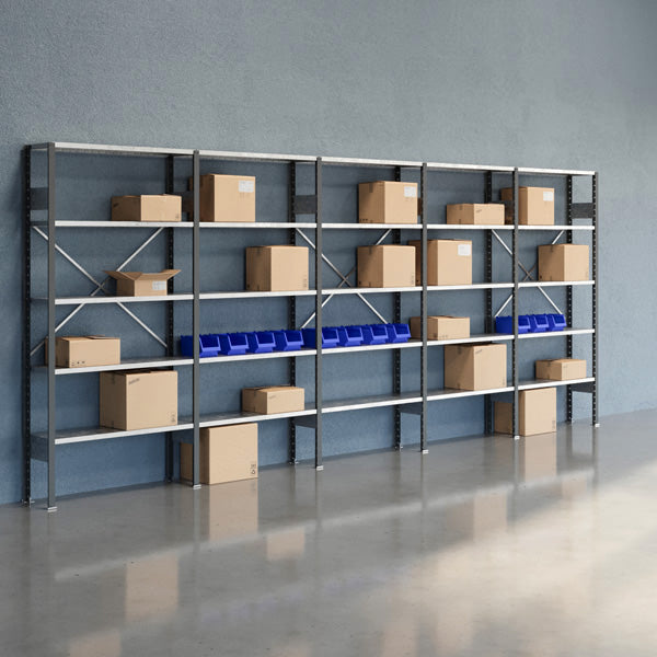 Lagerreol V06 2100x5000x300. Levereres komplet med 8 stolper med fod, 12 tværplader, 3 rygkryds og 25 hylde med hyldekroge. Mørkegrå stolper, RAL 7012 og galvaniserede hylder.