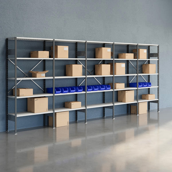 Lagerreol V06 2100x5000x400. Levereres komplet med 8 stolper med fod, 12 tværplader, 3 rygkryds og 25 hylde med hyldekroge. Mørkegrå stolper, RAL 7012 og hylder i lysegrå RAL 7035.