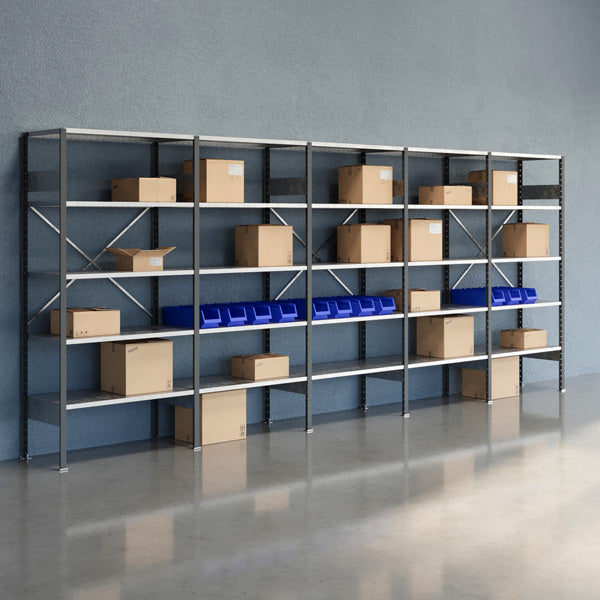 Lagerreol V06 2100x5000x500. Levereres komplet med 8 stolper med fod, 12 tværplader, 3 rygkryds og 25 hylde med hyldekroge. Mørkegrå stolper, RAL 7012 og galvaniserede hylder.